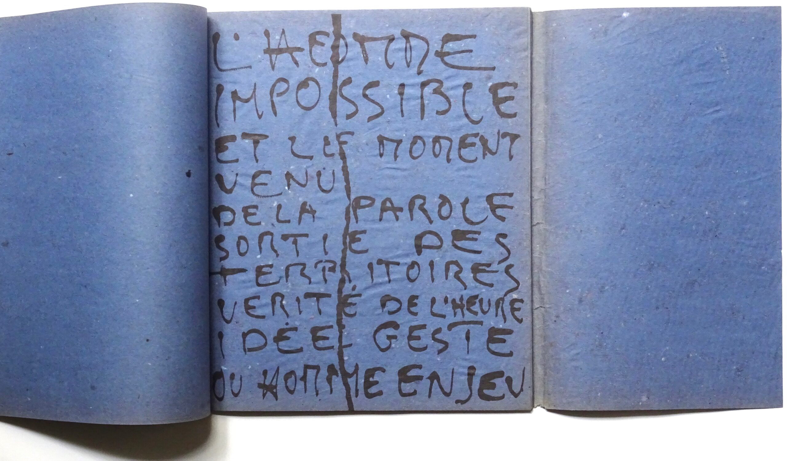 Parallèlement cette publication, Wolman exposa à la galerie Nane Stern la réplique, agrandie et retranscrite sur de grandes feuilles transparentes superposées et «séparées» par leur milieu, des 29 pages du livre.