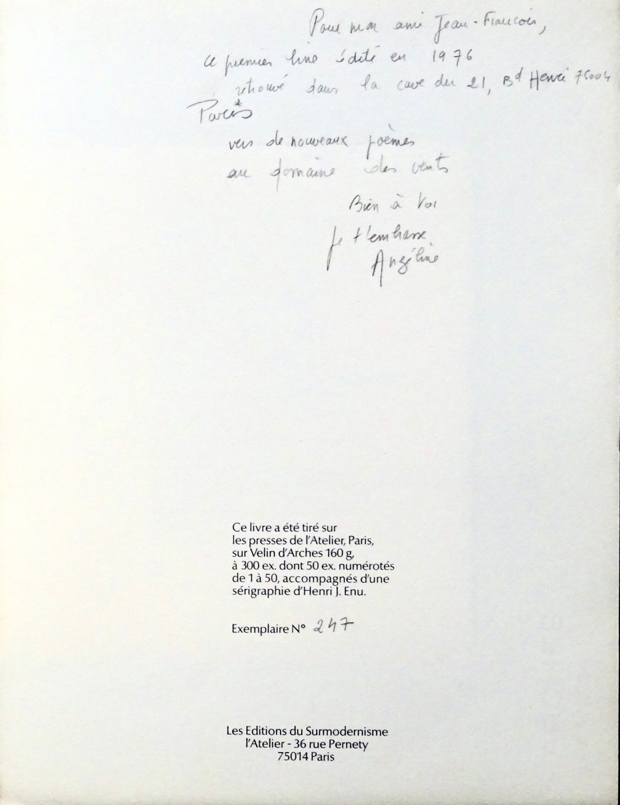 Envoi autographe de l’auteur : « Pour mon ami Jean-François, ce premier livre édité en 1976 retrouvé dans la cave du 21, Bd Henri 75004 Paris – Vers de nouveaux poèmes au domaine des vents – Bien à toi – je t’embrasse – Angeline »